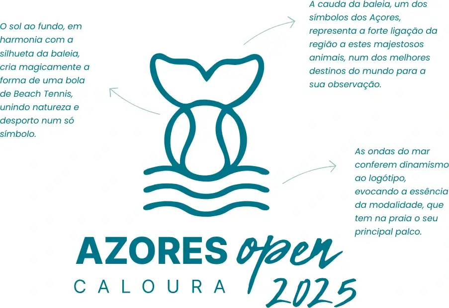 Um evento desta magnitude exige um logotipo distinto e que se conecte diretamente com o território, refletindo sua identidade única. Com isso em mente, foi criado um conceito gráfico criativo que incorpora elementos simbólicos dos Açores: a bola de beach tennis, o cachalote, o pôr do sol e as ondas do mar. Esses elementos não só representam a essência da modalidade, mas também capturam a beleza natural da região, criando uma identidade visual que comunica de forma clara e memorável a ligação entre o desporto e o território.